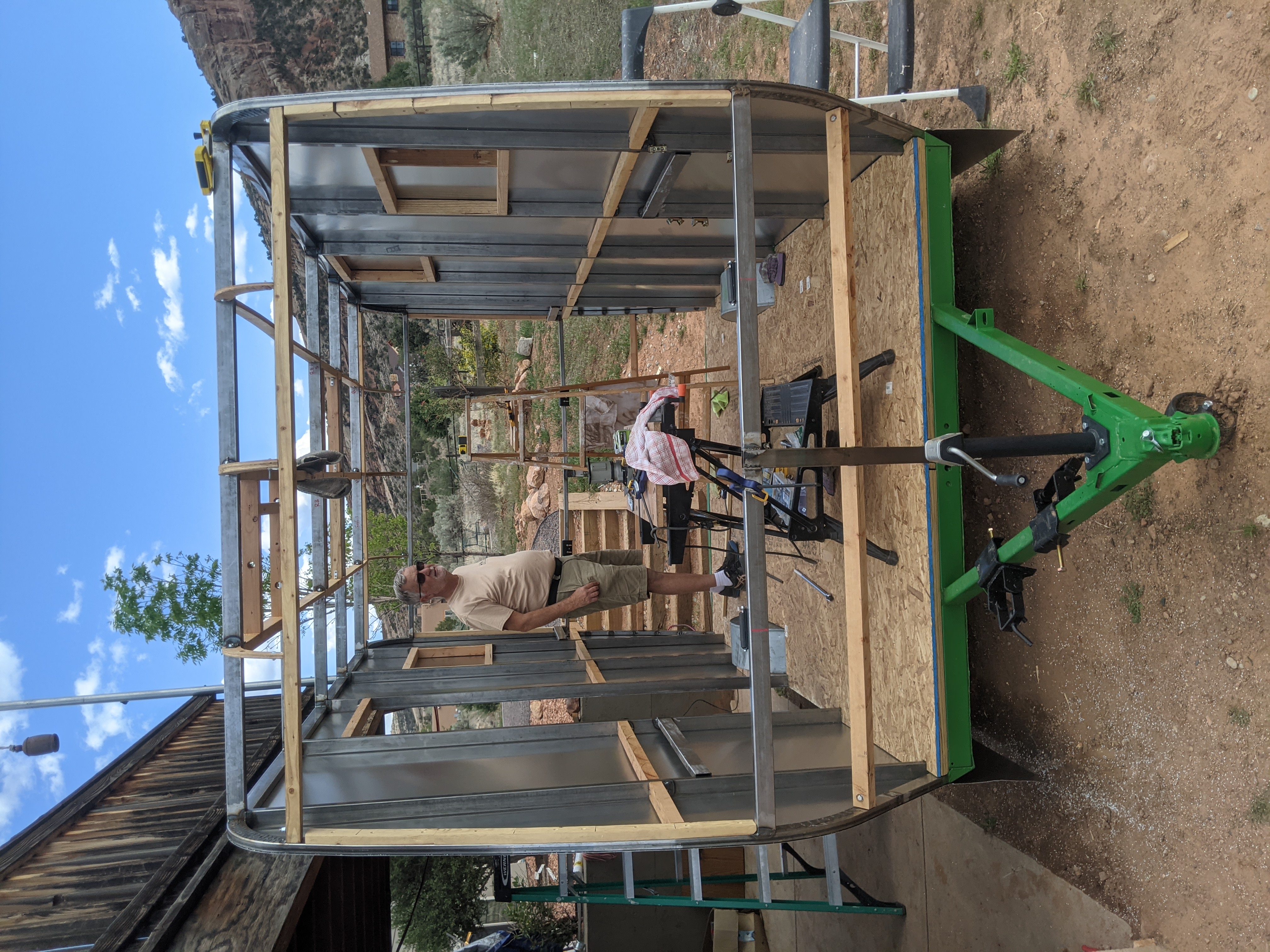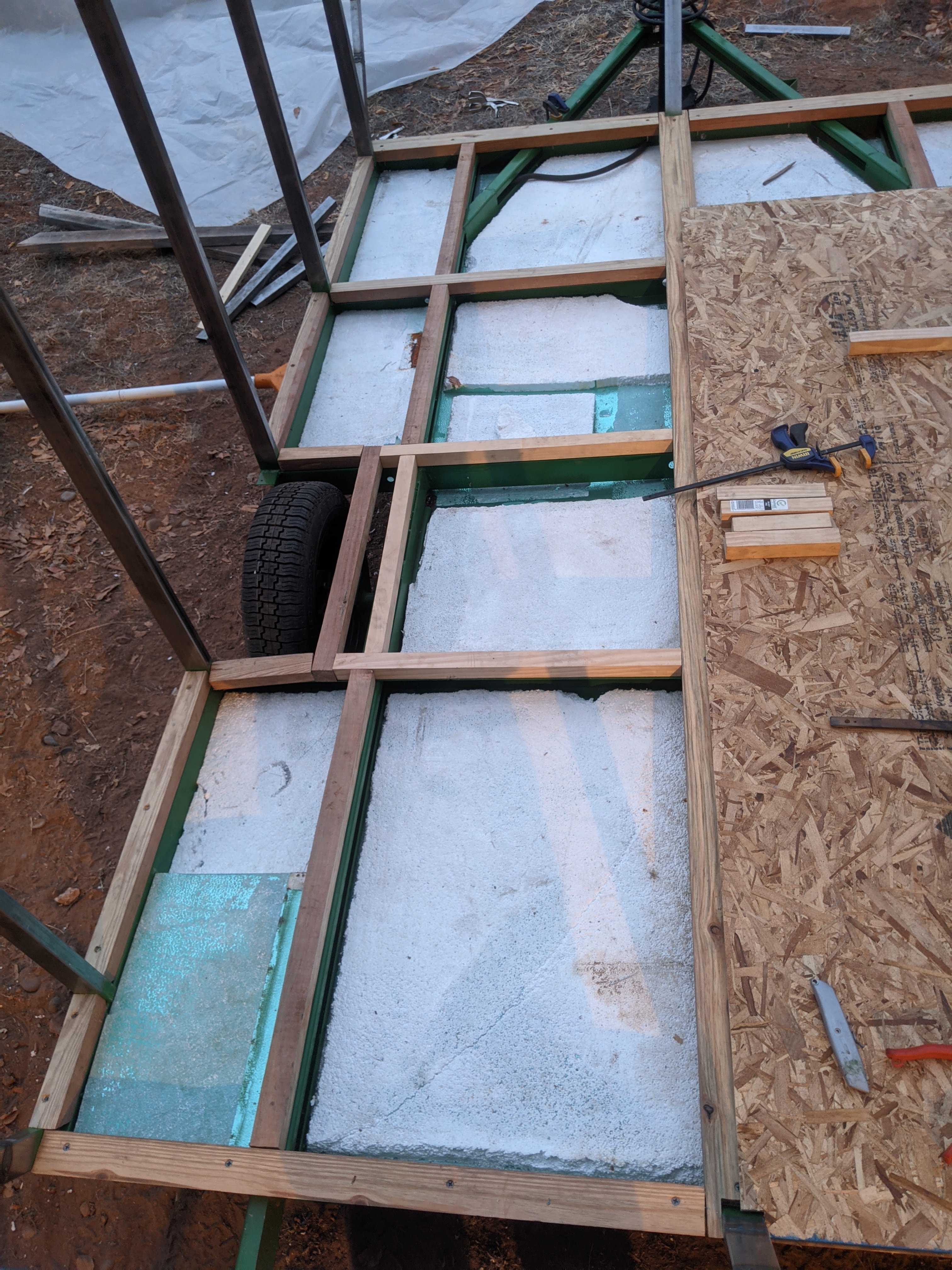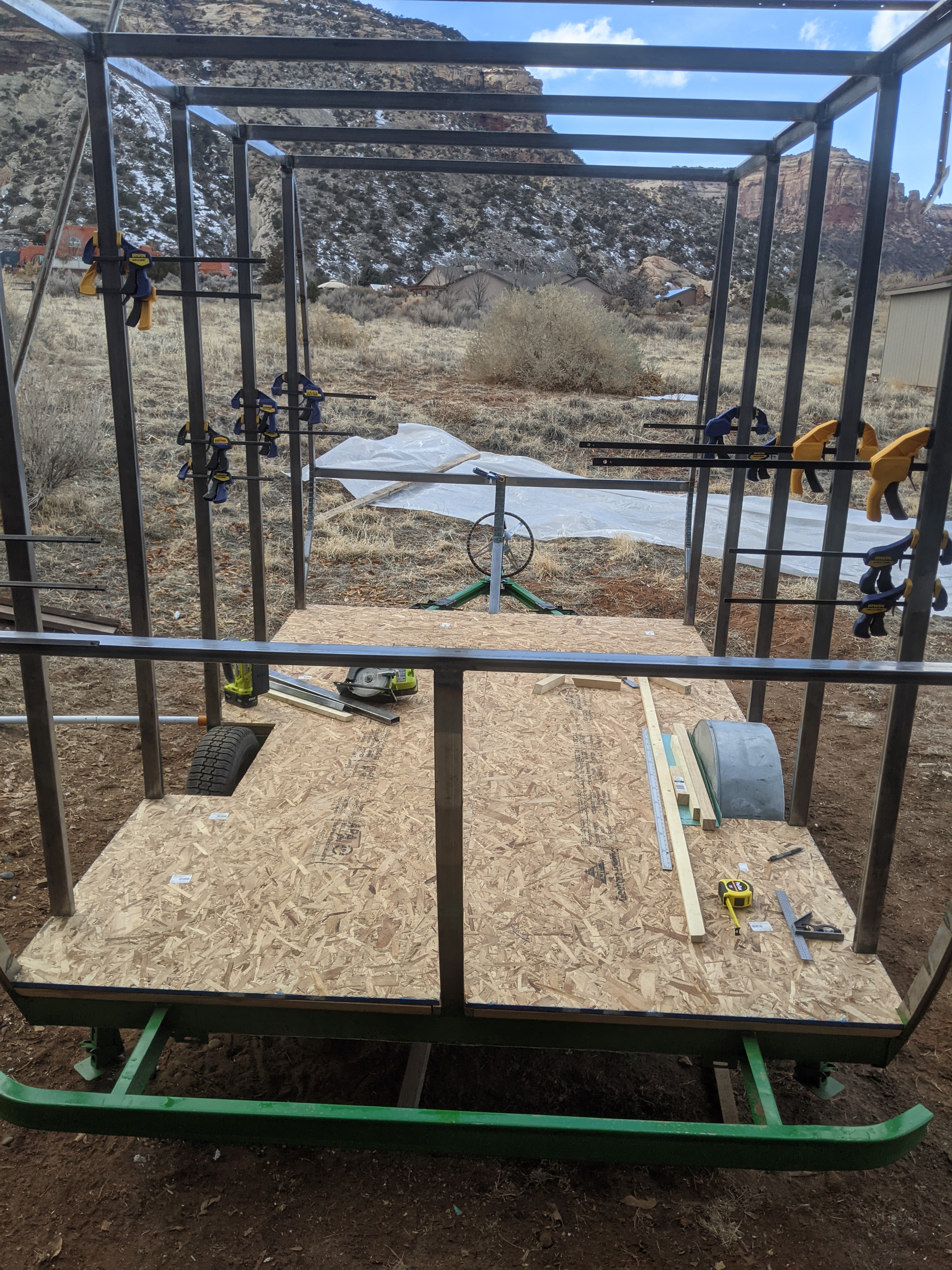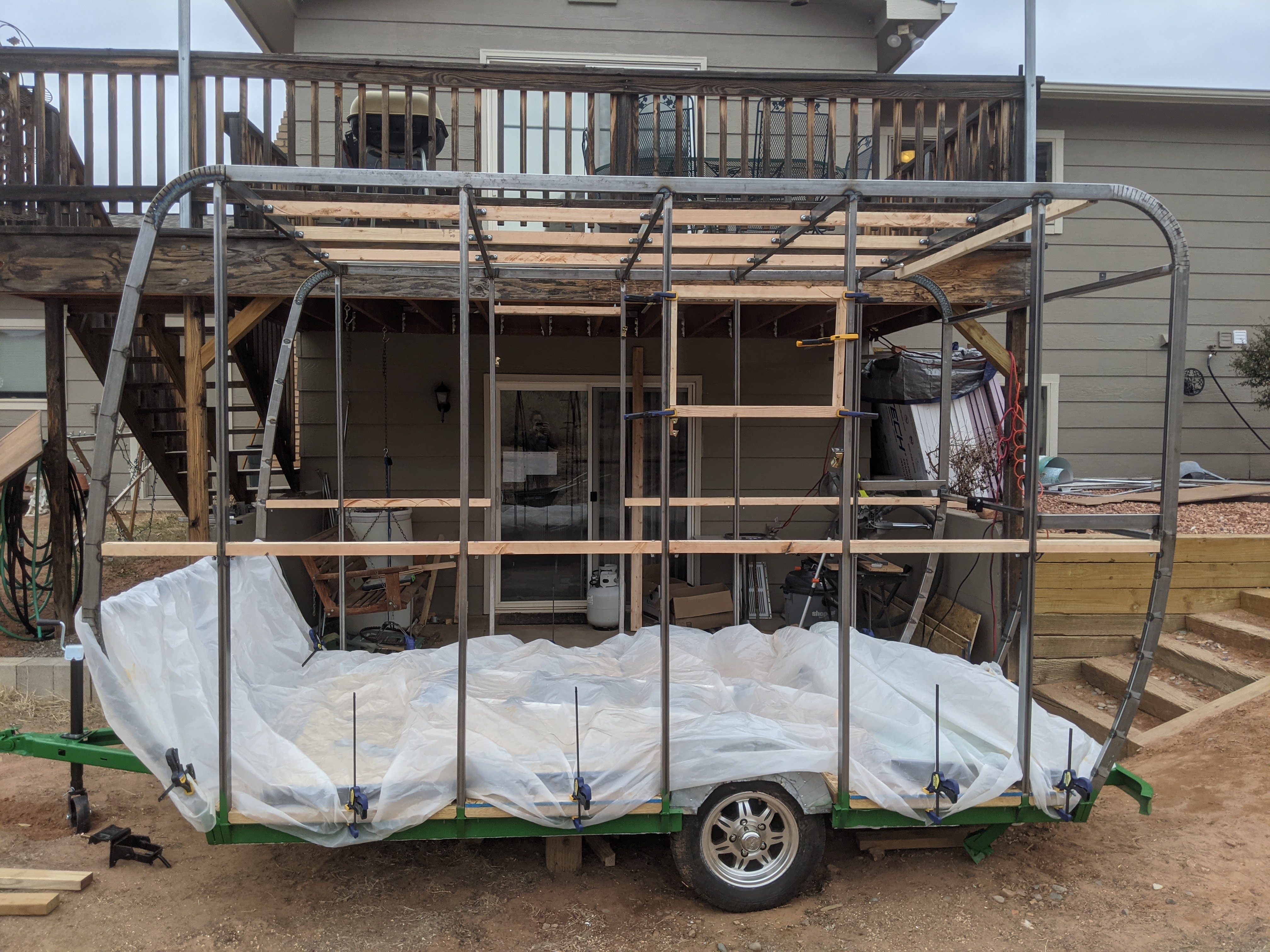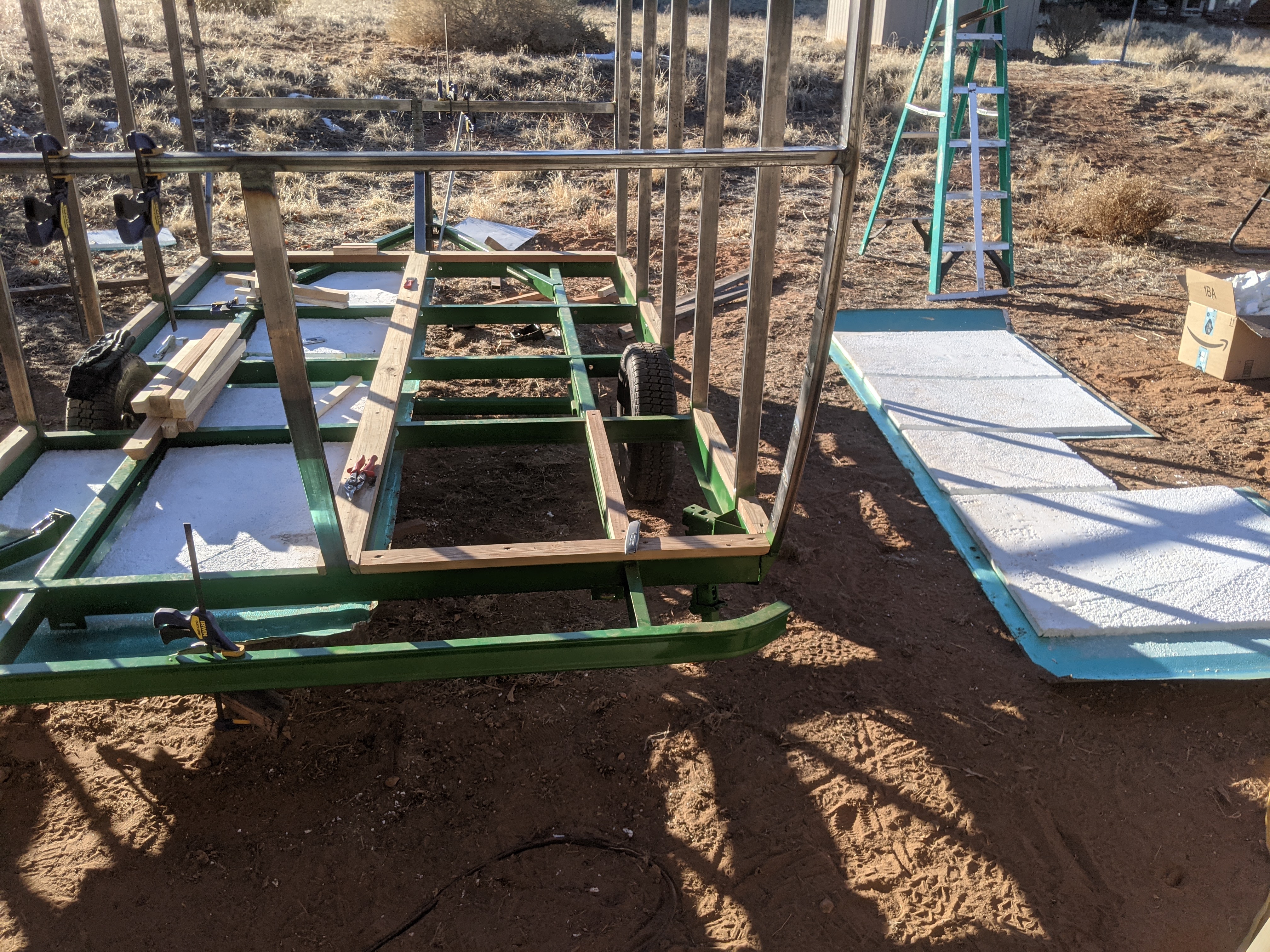 I attached an aluminum underbelly and a wooden subfloor to the trailer, with room for insulation. The propane lines would later be installed in-between these layers.