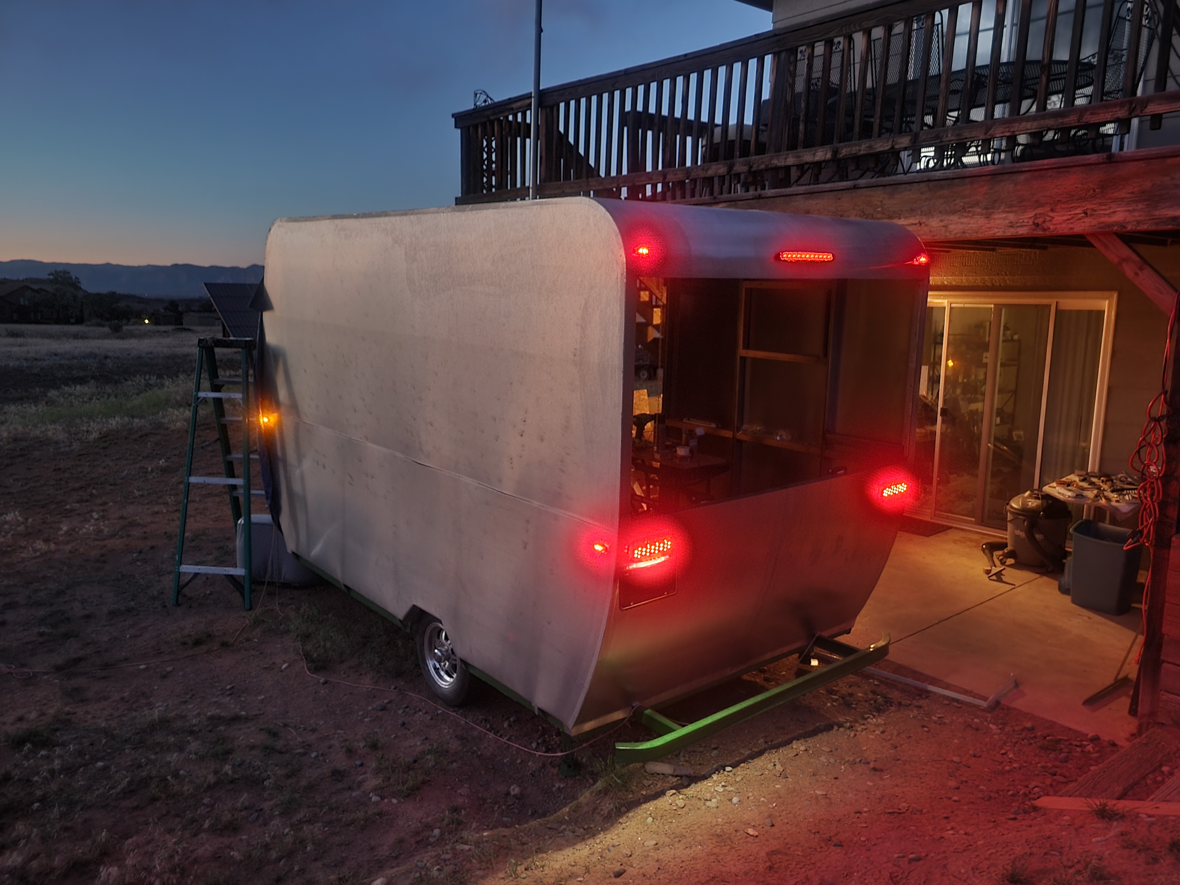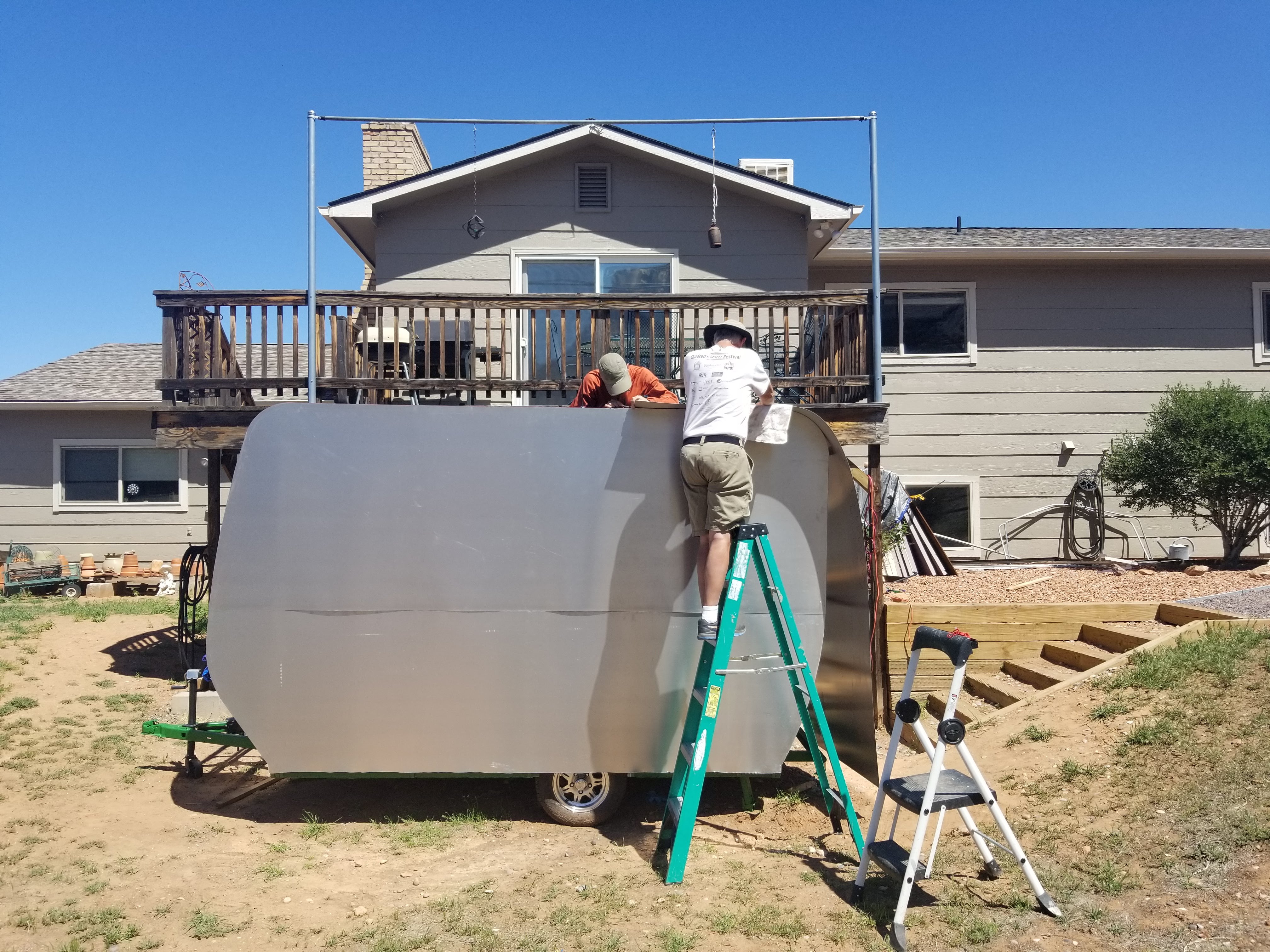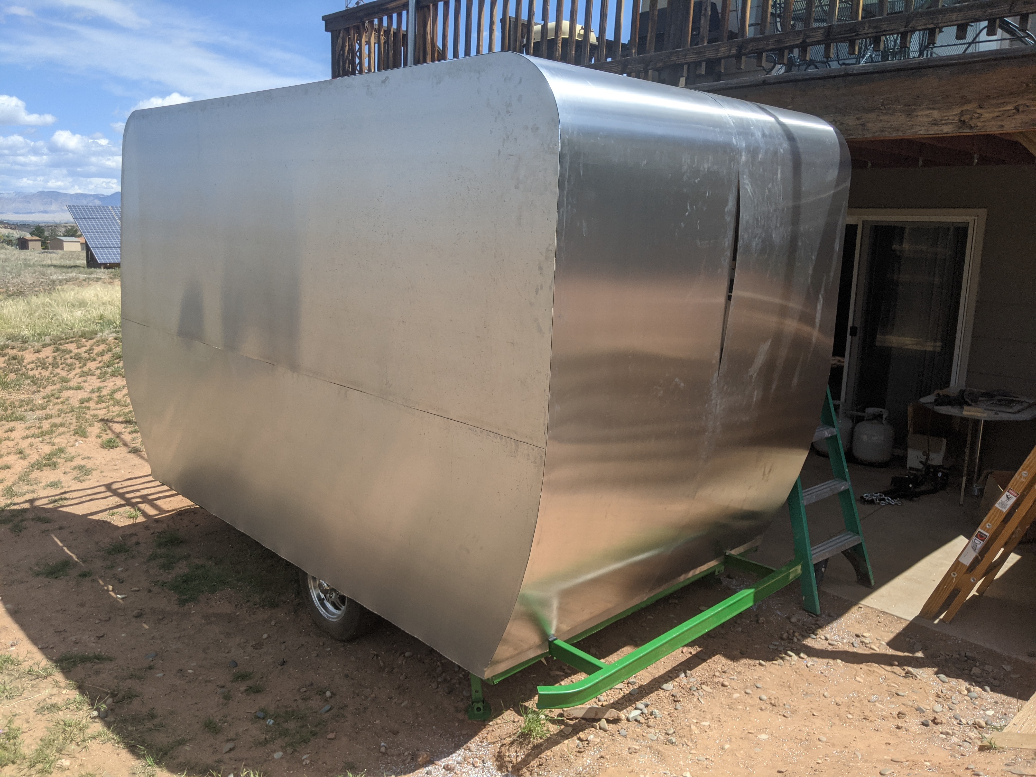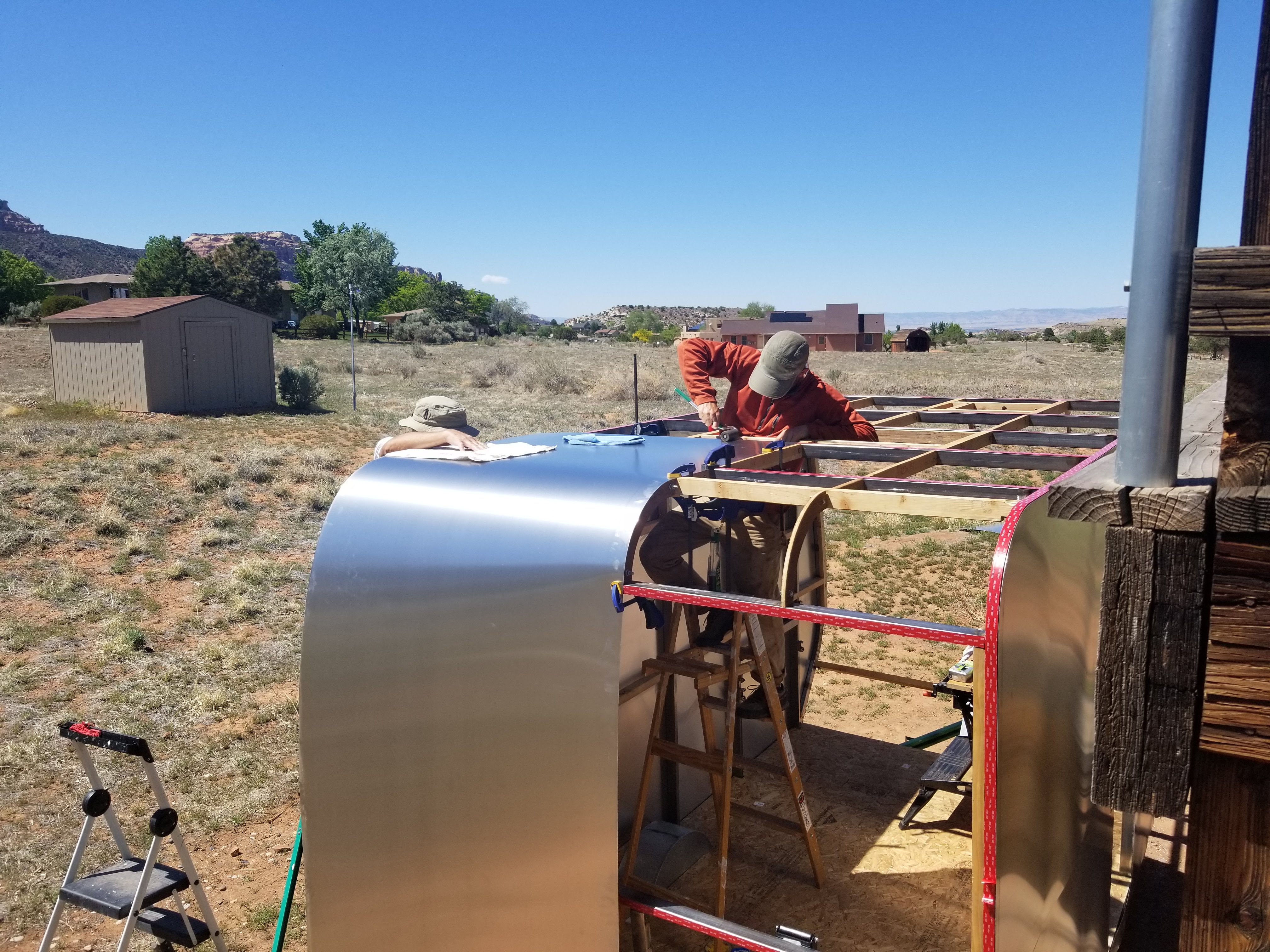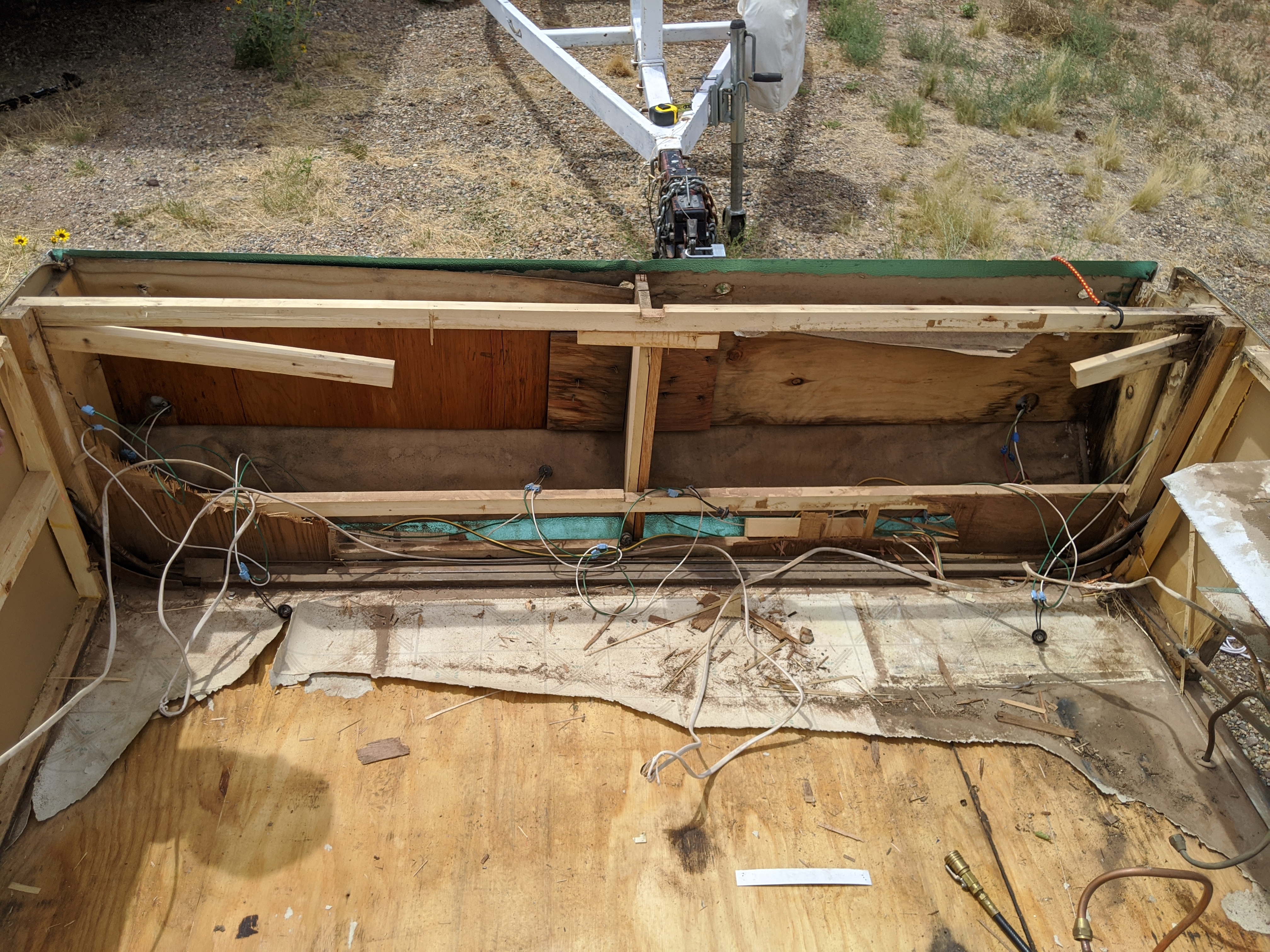 I attached an aluminum underbelly and a wooden subfloor to the trailer, with room for insulation. The propane lines would later be installed in-between these layers.